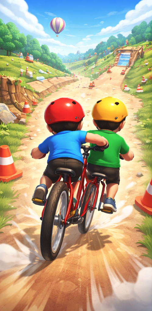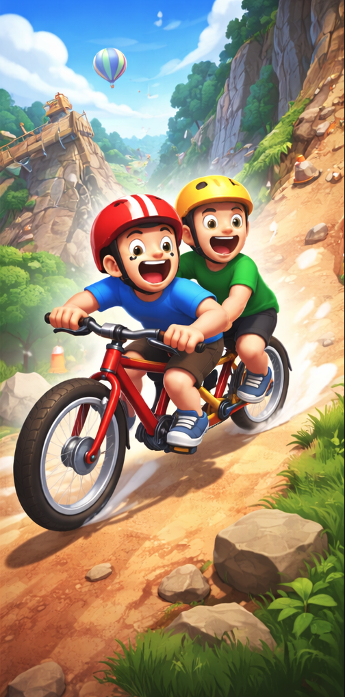 A party-physics game on a tandem bicycle. Ride solo or with a partner — pedal, steer, and navigate to your destination before time runs out!
